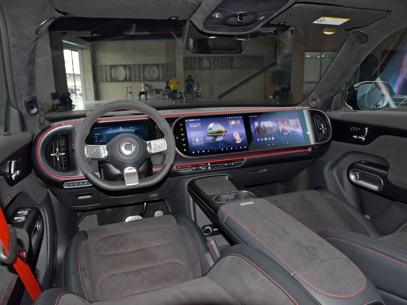再来看车尾部分,车尾设计与车头形成完美呼应,同样延续了方盒基调与胶囊元素。贯穿式超红光 LED 尾灯是视觉核心,内部光源布局与前大灯组遥相呼应,熏黑处理增强了立体感,点亮时在夜间拥有极高辨识度。车顶的小尺寸扰流板不仅优化了空气动力学表现,更与高位刹车灯配合提升了行车安全性。后包围经过重新设计,采用隐藏式排气管布局,让车尾更显简洁利落,粗壮的防擦板则延续了车身侧面的力量感风格。尾门筋线的勾勒强化了层次感。